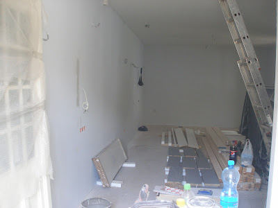 A nappaliban még hadiállapotok uralkodnak.Éppen a lépcső darabjait festjük.