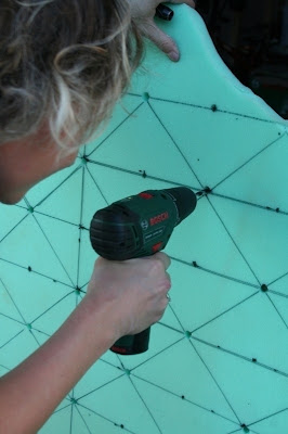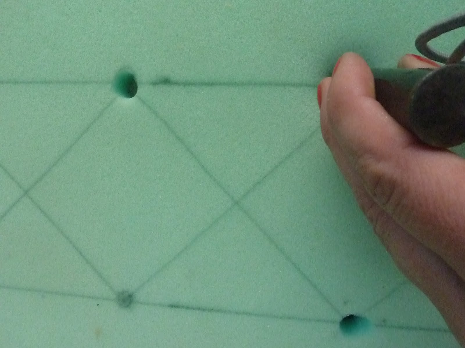 Azután, a szivacsot szabtam a pozdorjához. Szivacsot táblában vehettek, kárpitoskellék szaküzletben. Felragasztottam a szivacsot a pozdorjára, ehhez én speciális spray ragasztót használtam. A szivacson kimértem a mintát. Én rombusz formában akartam feltűzni a gombokat, ezek helyét mértem ki, és végül,a jelöléseknél kilyukasztottam a szivacsot. Erre azért van szükség, mert így a gomb majd szebben “beül” a helyére.