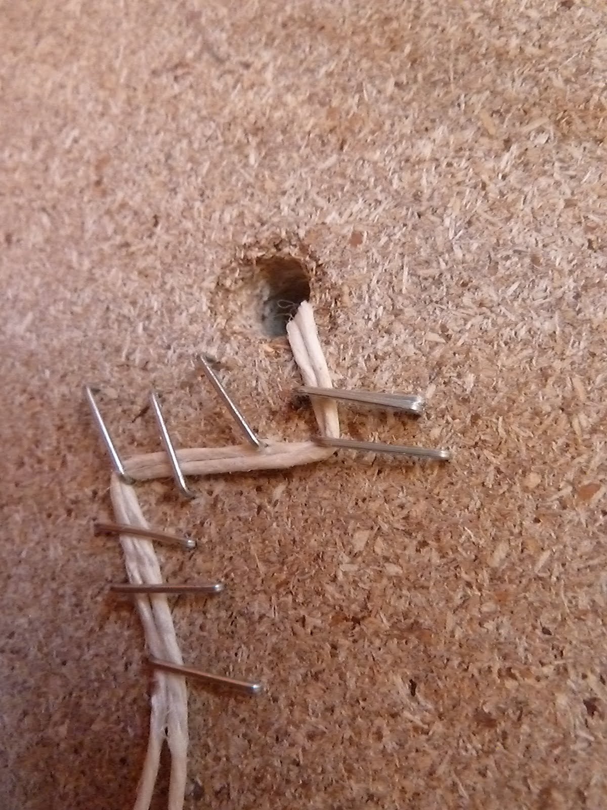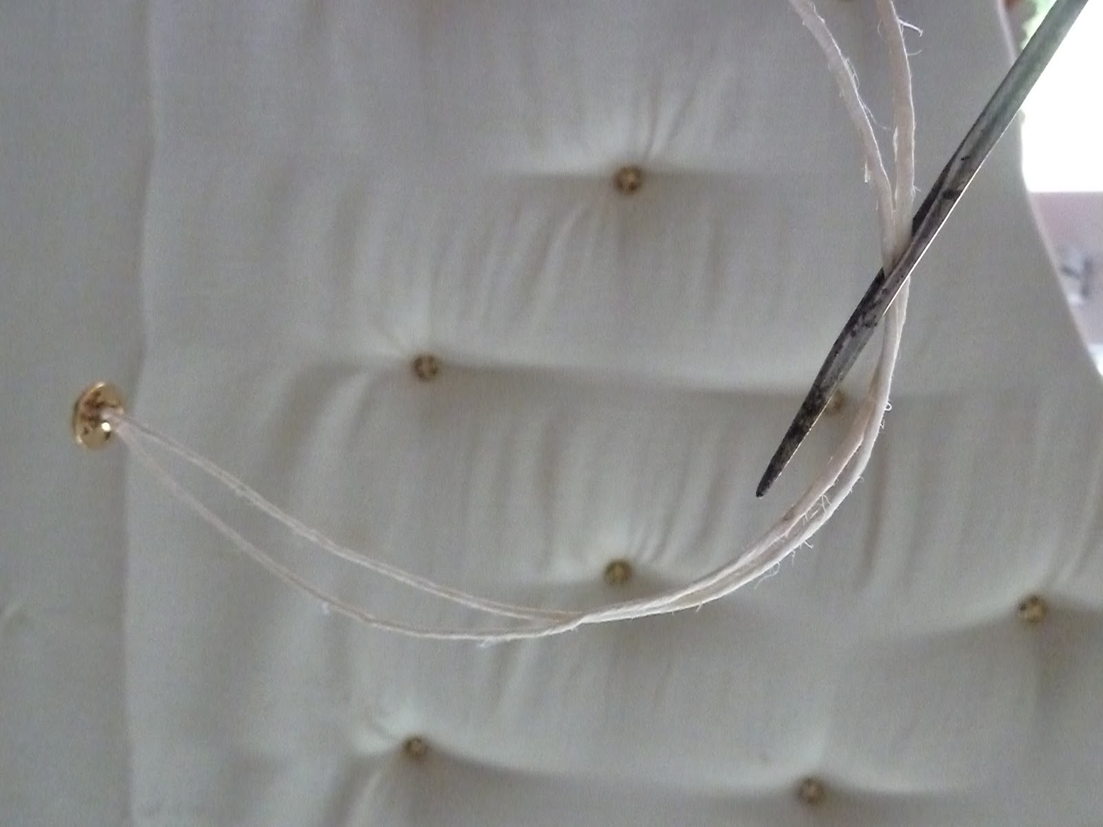 A zsinegeket a gombokon átfűztem, majd egy hosszú,két élű kárpitostűvel, a zsineg mindkét szárát átjuttattam a szivacs túloldalára, valahogy így: