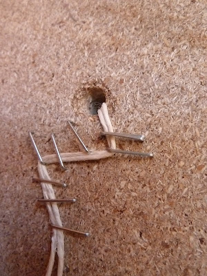 Ezután, kifúrtam a lyukakon keresztül a pozdorját. Mesterem valószínűleg a fejét fogta volna, mert nem így tanította, de időt akartam nyerni azzal, hogy nem számolgatok külön a fán, és külön a szivacson. Lényeg, hogy a fúrószál ne érjen hozzá a szivacshoz, mert darabokra cincálja! Ha megígéritek, hogy erre figyeltek, csinálhatjátok így.