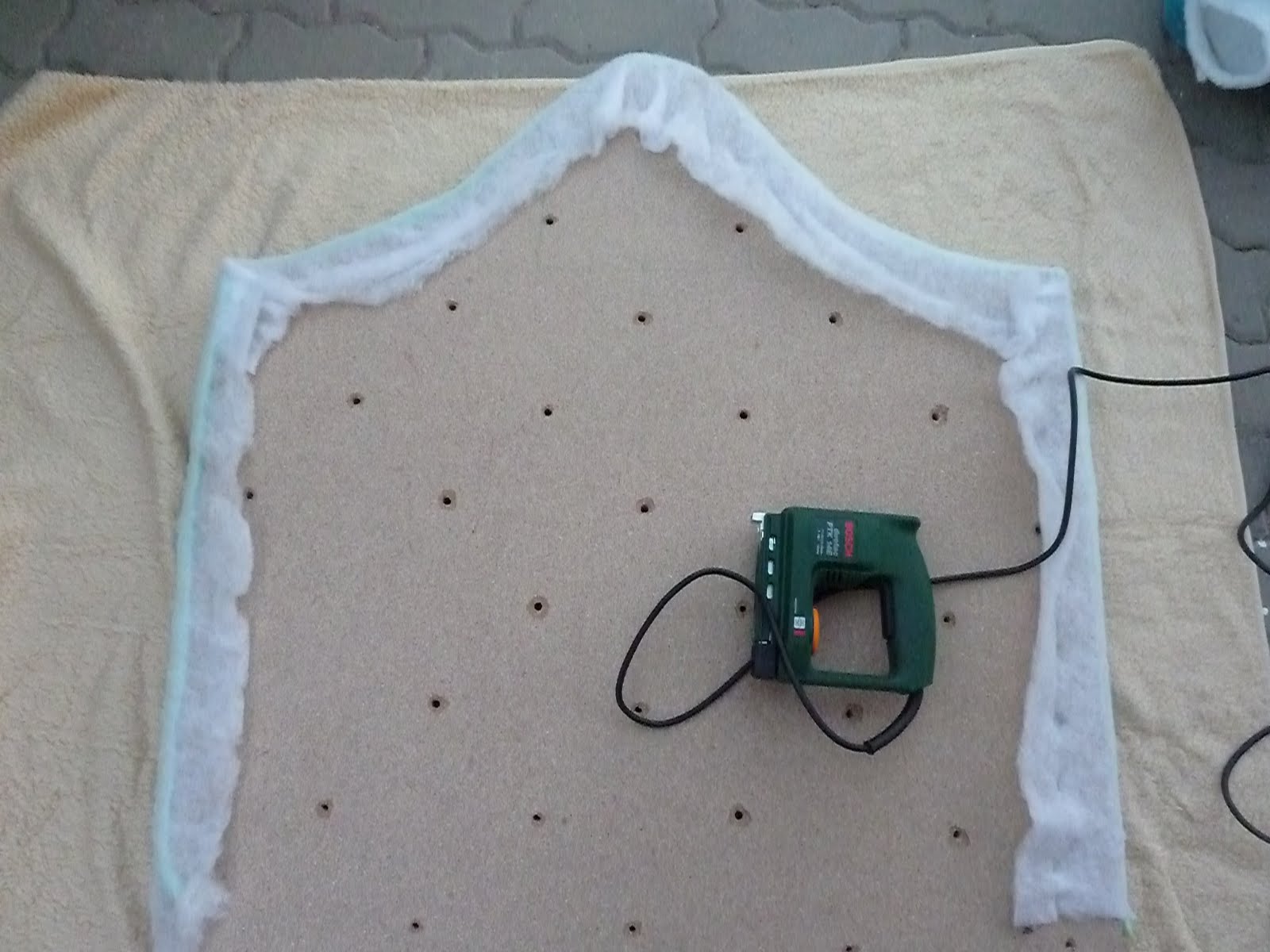 Ezután, elektromos tűzőgéppel, feltűzöm a frízt, ami a szivacsot védi, és finomítja a széleket, majd jöhet az anyag.Az anyagot úgy mérjétek, hogy legyen belőle elég a tűzéshez is, meg a végén, amikor kitűzzük a szélét, akkor is maradjon elég. Én eredetileg, nagyon mély tűzésű fejvéget szerettem volna készíteni, de kábé másfél óra szarakodás munka után, kiderült, hogy én bizony, elszámoltam magam az anyaggal. Maradtam az egyszerűbb tűzési verziónál.