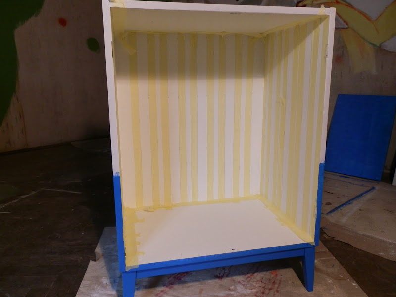 Miután az alapozó és a belső rész fehér festéke megszáradt, a csíkozáshoz először kimértem a csíkok helyét, vízszintmérővel behúztam a csíkokat, majd maszkoló szalaggal kiragasztottam a helyüket, ezután festettem fel három rétegben a kék csíkokat.