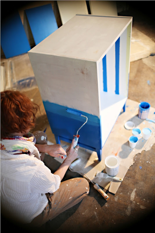 A legsötétebb kéktől haladva, egyre világosodó kékkel csíkoztam a kis komódot. Az alapfestékhez folyamatosan kevertem a fehér festéket, hogy a kék szín csak árnyalatában változzon.