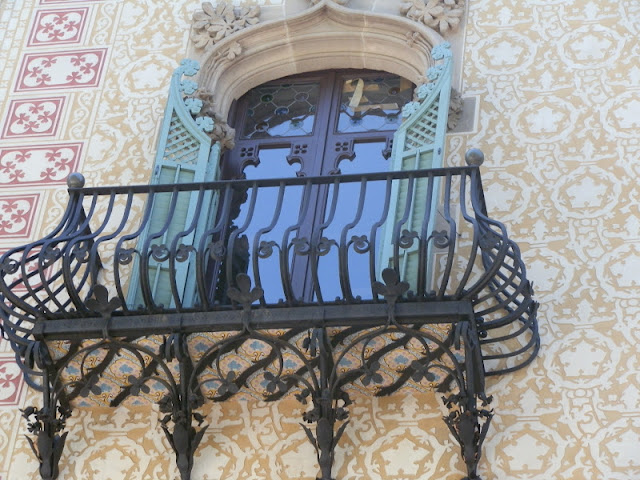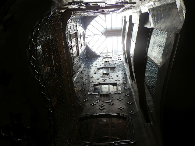 Az első Gaudi épület, amiben jártunk, a Casa Batlo volt. Gaudi a Batlo család számára tervezte a ma is teljesen élhető otthont. A házat teljes egészében a tenger ihlette. A lépcső egy őskori tengeri hüllő csontvázát idézi, a falakon a minta a teknősbéka páncéljának mintázatát ismétli, és a falakon a tenger hullámzása látható. Az ablakokon is.