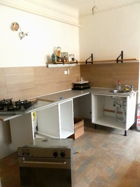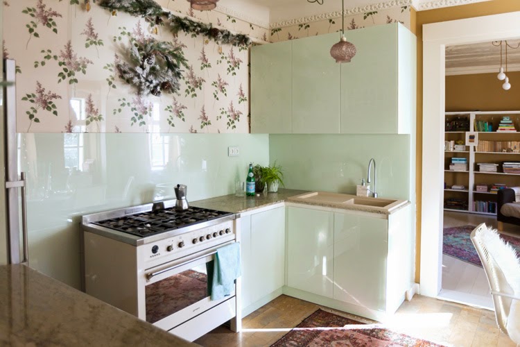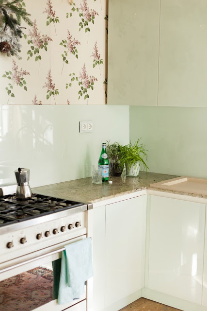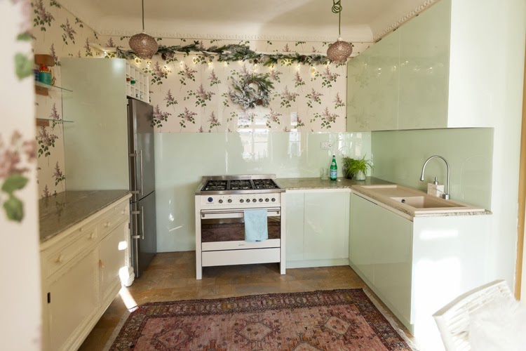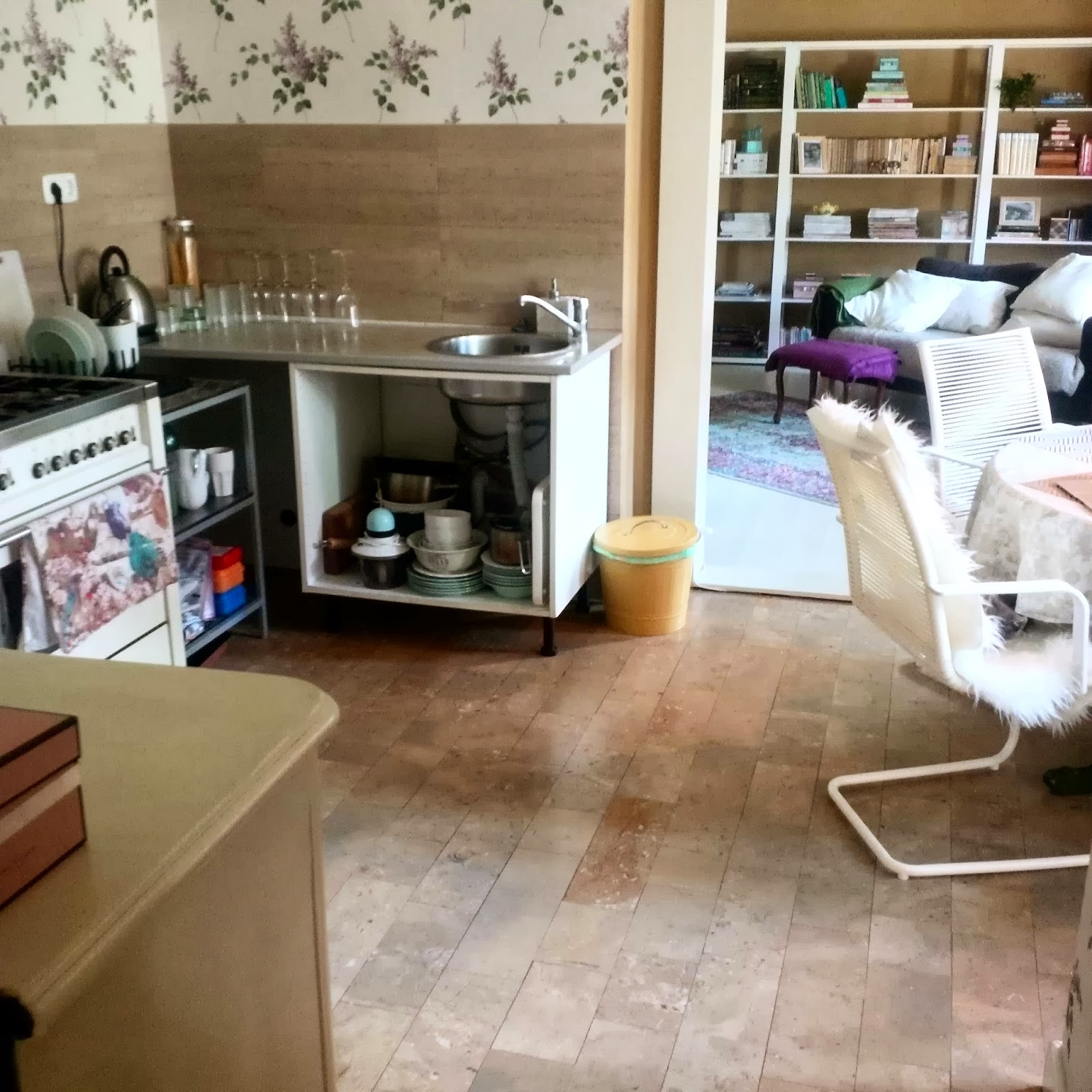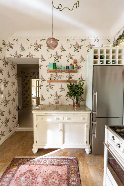 Onnan indultunk, hogy a komód mintájára szeretnénk majd konyhabútort, hogy arra rímeljen. Ezt fontolgattuk egy darabig, majd elvetettük: hiszen pont ezt a szabályosságot nem akarjuk, ezt a magától értetődő választást. Valahogy úgy túl romantikussá vált volna ez a konyha, a virágos tapétával, a vintage sütővel és a régi tálalóval.