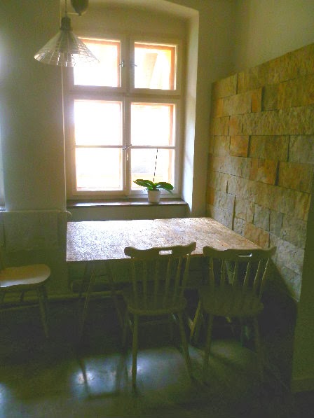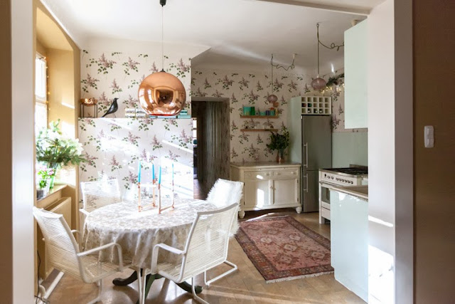 A stílusa pedig ki tudja milyen.Talán eklektikus, talán frivol, talán egy kicsit franciás, talán egy kicsit bohém. Mi szeretjük úgy ahogy van. Az étkezőt a furcsa kerti székekkel, a csodás vörösréz lámpával, a régi tálalót, a hatalmas angolos stílusú sütőt, a hipermodern üvegkonyhával, az isztambuli bazárban tíz éve vett szőnyeggel és a virágos tapétával együtt.