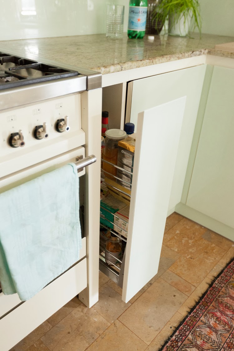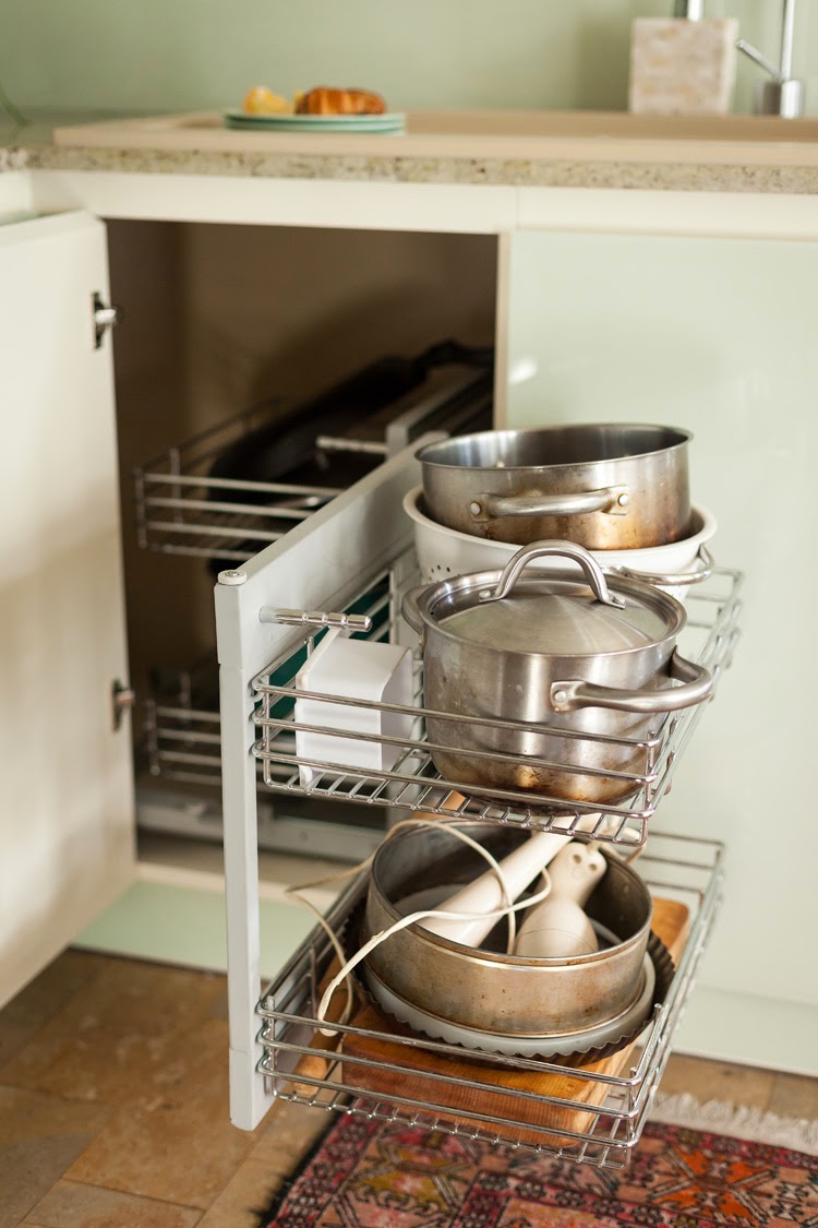 A hely legjobb kihasználása érdekében áldoztunk a speciális szerkezetekre is. A sarokelem kicsúsztatható, így a legbelső zugot is telepakolhatom. Van egy szintén kihúzható fűszertartóm és még a kincset érő mosogató gép is elfért a kicsi konyhában. A felső szekrényekben a tálak, poharak, tartós élelmiszerek kaptak helyet, míg a tálaló rejti az evőeszközöket és az élelmiszer alapanyagokat. No és van egy külső kamránk is a tornác végében, ott tartom az évente csak egyszer használt konyhai cuccokat.