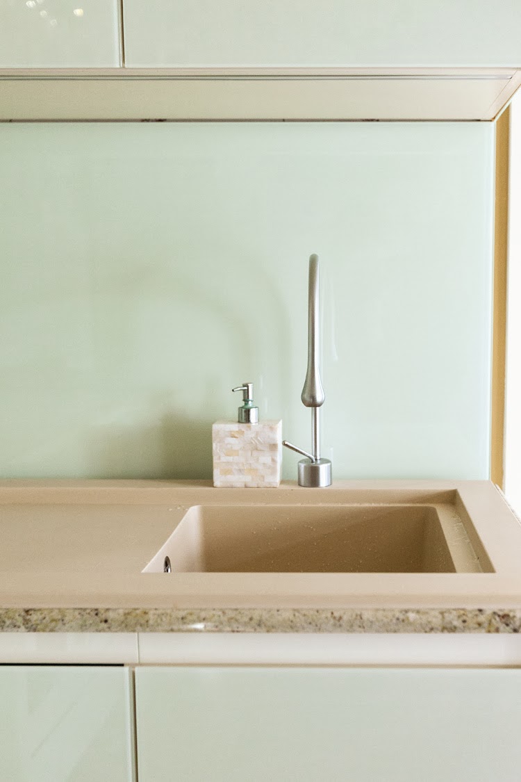 A frontok színét a tálaló színéhez igazítottuk, ami a Farrow and Ball lime white színe. Az üveg alapból zöldes, így számítottunk rá, hogy nem lesz a végeredmény pontosan ugyanolyan, mint a komódon, de ez végül nem zavart. Az üvegborítás nagyon modern, nagyon egyszerű vonalakat kíván, így az volt a kérésem, hogy fogantyú se legyen a frontokon.