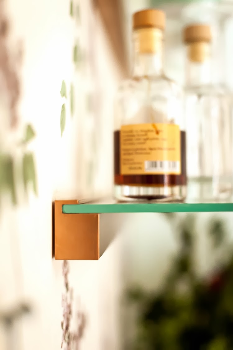 A tálaló felett üvegborítás van (ami a képeken még hiányzik, mert a hűtő utólagos beépítése miatt nem lett jó a méret és újat szabattunk) és Ikeás fürdőszobai üvegpolc, aminek a konzolját én festettem át vörösréz színűre.