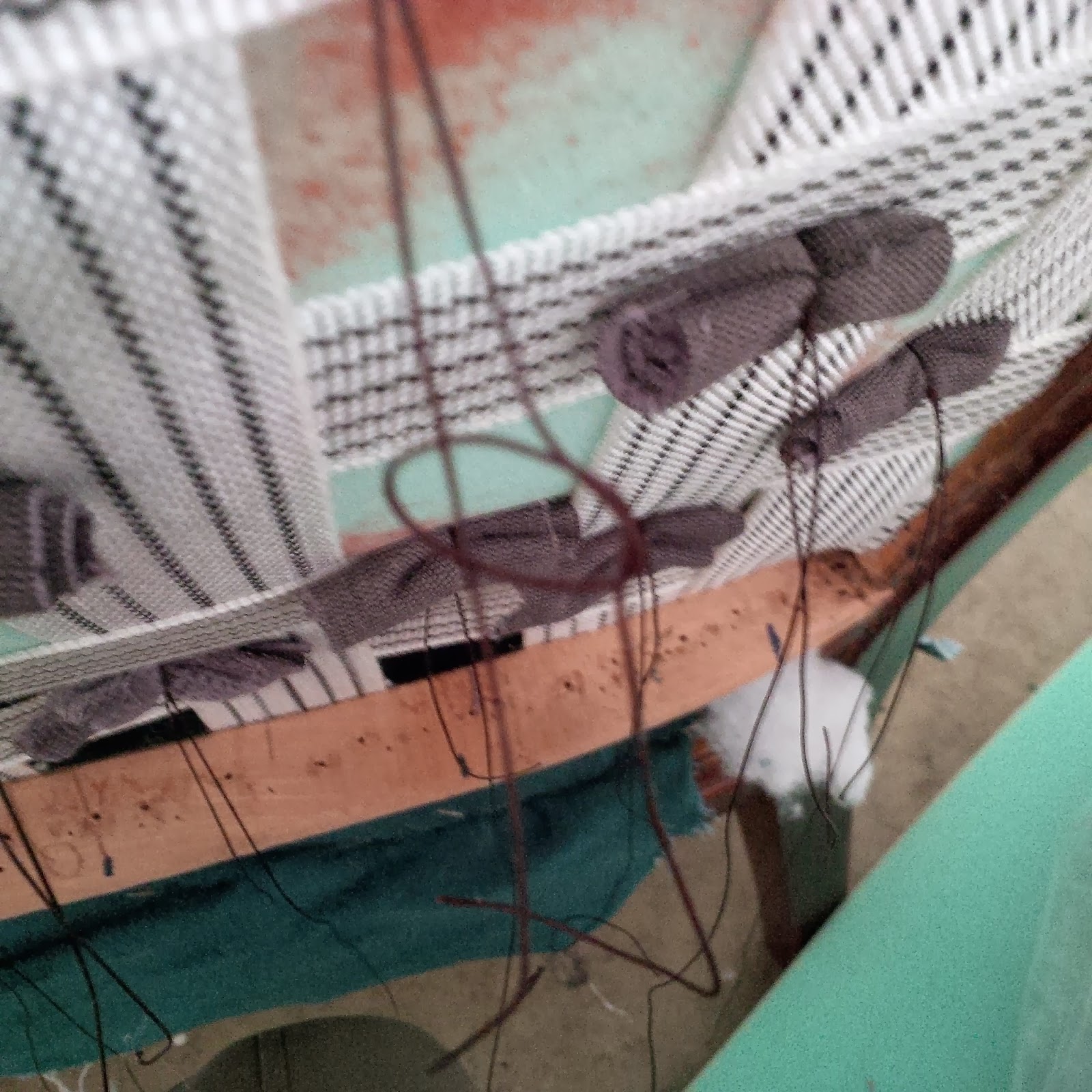 Ehhez a kétoldalú tűn áthúzzuk a gombot és a zsineg mindkét szárát. Igyekezzünk a behúzott lyuk közepébe találni, közben még rendezgetni a rácokon. Itt is fontos, hogy ne szivacsot, hanem hevedert találjunk az átszúrásnál! Nem kell újra “ellengombozni”, de az áthúzott szárakon úgy kössük meg a csúszócsomót hogy a feltekert kárpitdarabot ez a zsineg is közrefogja. Ennél a csomózásnál már húzhatjuk rögtön maximumig a csomót. Csak semmi pánik, ez már gyorsabban halad, fél óra alatt végeztem egy sorral.
