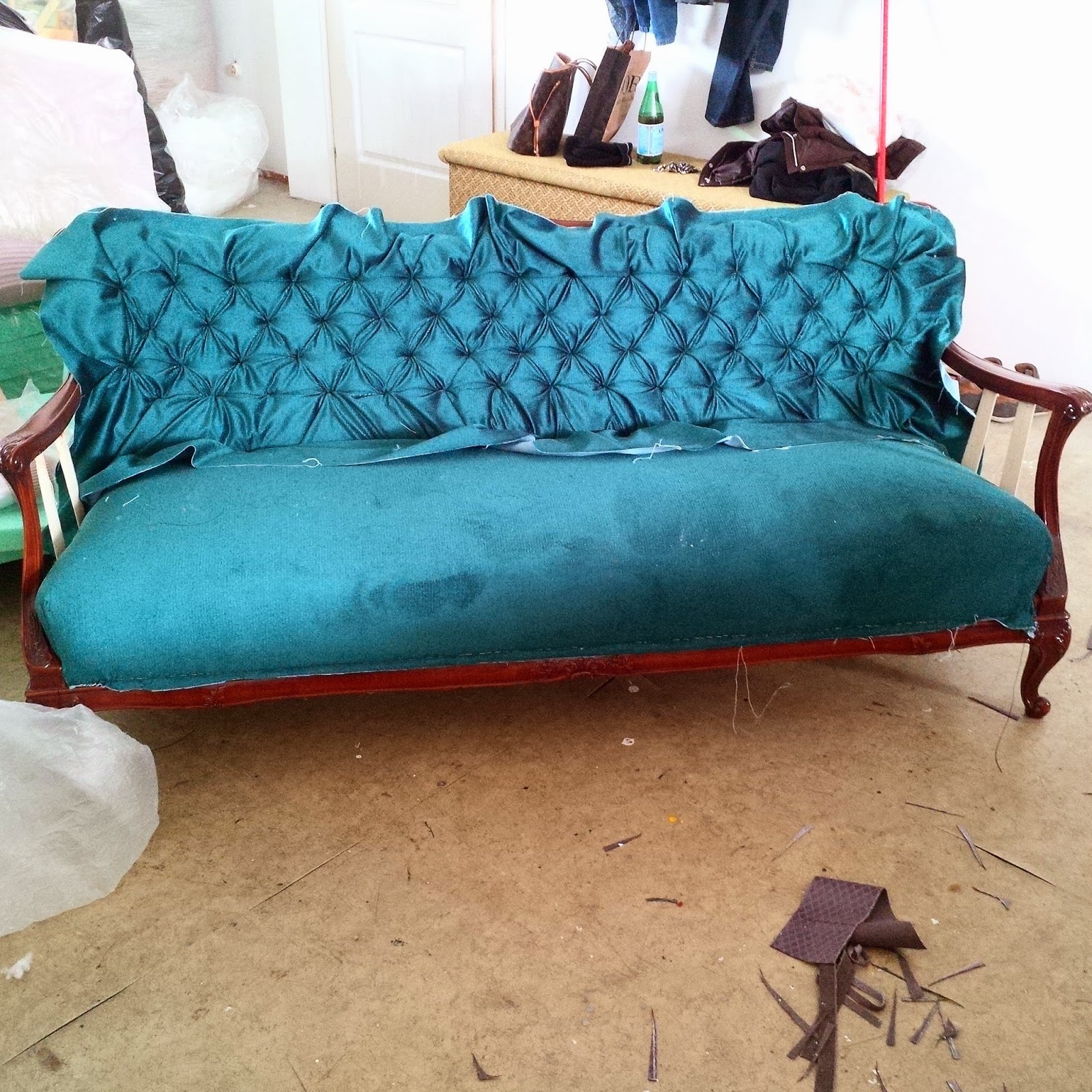 Megfordítom a kanapét, hogy könnyebben hozzáférjek és visszahajtva az anyagot elrendezem és kitűzöm a kárpitot. Végiglövöm, szépen, körben a keret mentén, eltakarva a feliratot és a dátumot egy jó időre.