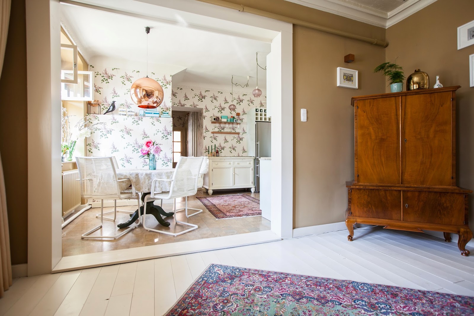 Nekem sok volt a konyhád, mikor először láttam, illetve csak a tapéta. De ezek a fotók, ahol nem csak a konyhát látni, hanem a nappalit is, ahová bekerült az a gyönyörű kanapé, meggyőztek. Így kerek, friss, üde, harmonikus. Éppen jó arányban van a kékes-zöldes és a lila, illetve ezek árnyalatai. Le a kalappal! Ildi